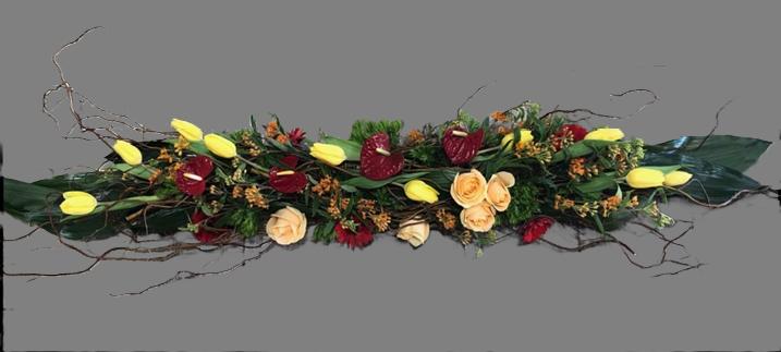 Dessus de cercueil 130 cm sarments de bois, tons rouge saumon et jaune
