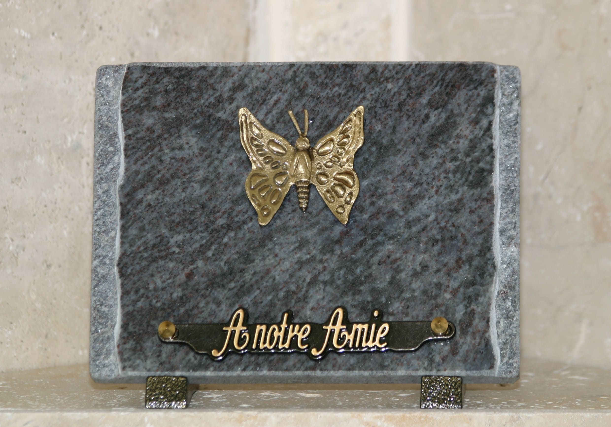 Plaque granit bleu éclaté bronze papillon
