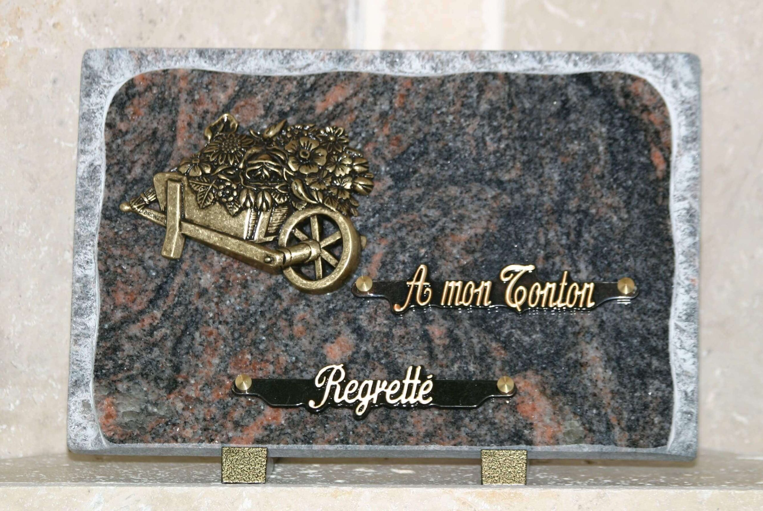 Plaque granit rose éclaté bronze brouette de fleurs